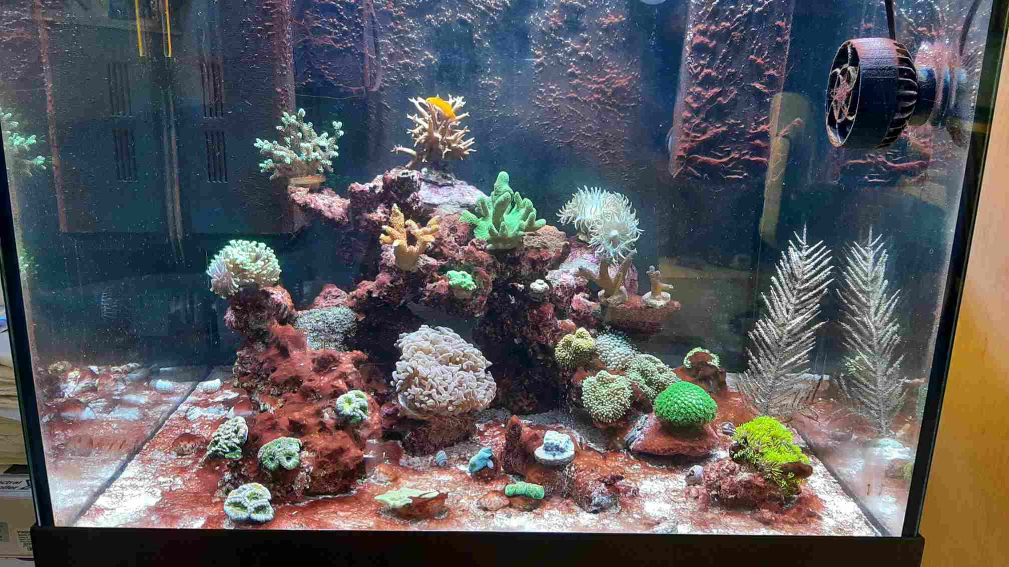 Seitdem gibt es nur noch Probleme. Nach dem Start sah alles toll aus. Die Korallen standen von Anfang an prima, die Farben wurden intensiver, aber bei der ersten ICP nach der 2-wöchigen Startphase hatte ich massiv erhöhte Antimonwerte. Mir wurde geraten, die Green Killing Machine UV-Lampe zu entfernen. Ohne UV-Lampe habe ich mich aber nicht getraut, neue Fische einzusetzen, weil meine Gobiodon okinawae leider stark zu Pünktchen neigt.