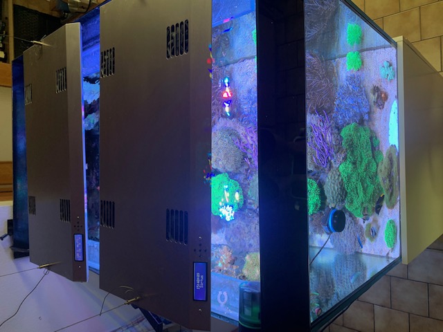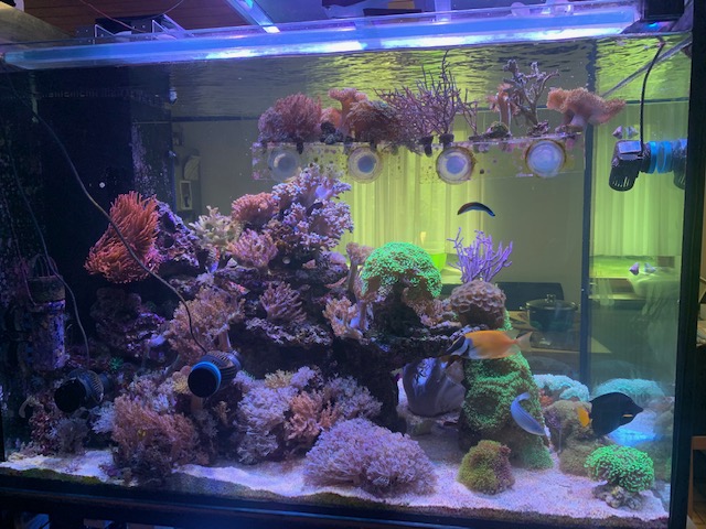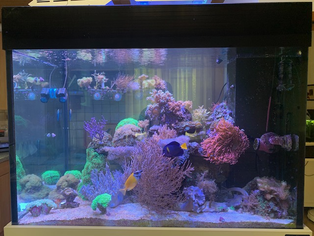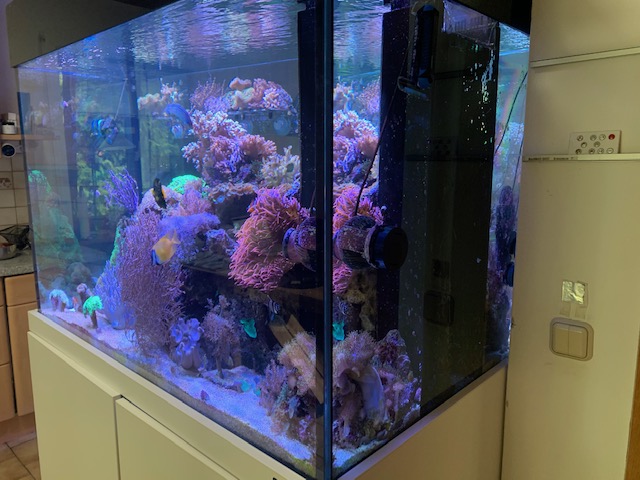 Vor gut einem Jahr habe ich im Zuge eines Umzugs einer Arbeitskollegin Ihr 640l Meerwasserbecken übernommen und komplett neu aufgesetzt. Dabei verwende ich als Salz: Red Sea SALT Pro und das ATI Essentials System (KH, CA, MG). Das Becken hat einen Ozongenerator, der über eine PH-Elektrode überwacht wird, sowie eine UV-Anlage. Beleuchtet wird über 2 programmierbare ATI Sirius X4. Die Beleuchtungszeit habe ich nun auf 10 Stunden reduziert. Diese war wohl bisher mit 12 Std. zu lange.