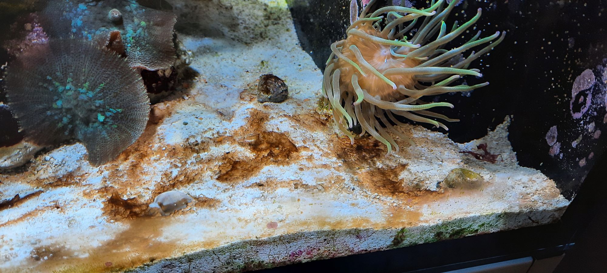 - Im Sand habe ich eigentlich Kegelfechterschnecken (die aber alle gestorben sind), Nassarius (einige wenige auch gestorben), Babylonia, Olivia, außerdem noch eine Yasha-Grundel mit Bellulus-Knalli. Seit dem Dinobefall sauge ich im Wechsel die Dinos oberflächlich vom Sand ab und mulme mit der Mulmglocke.