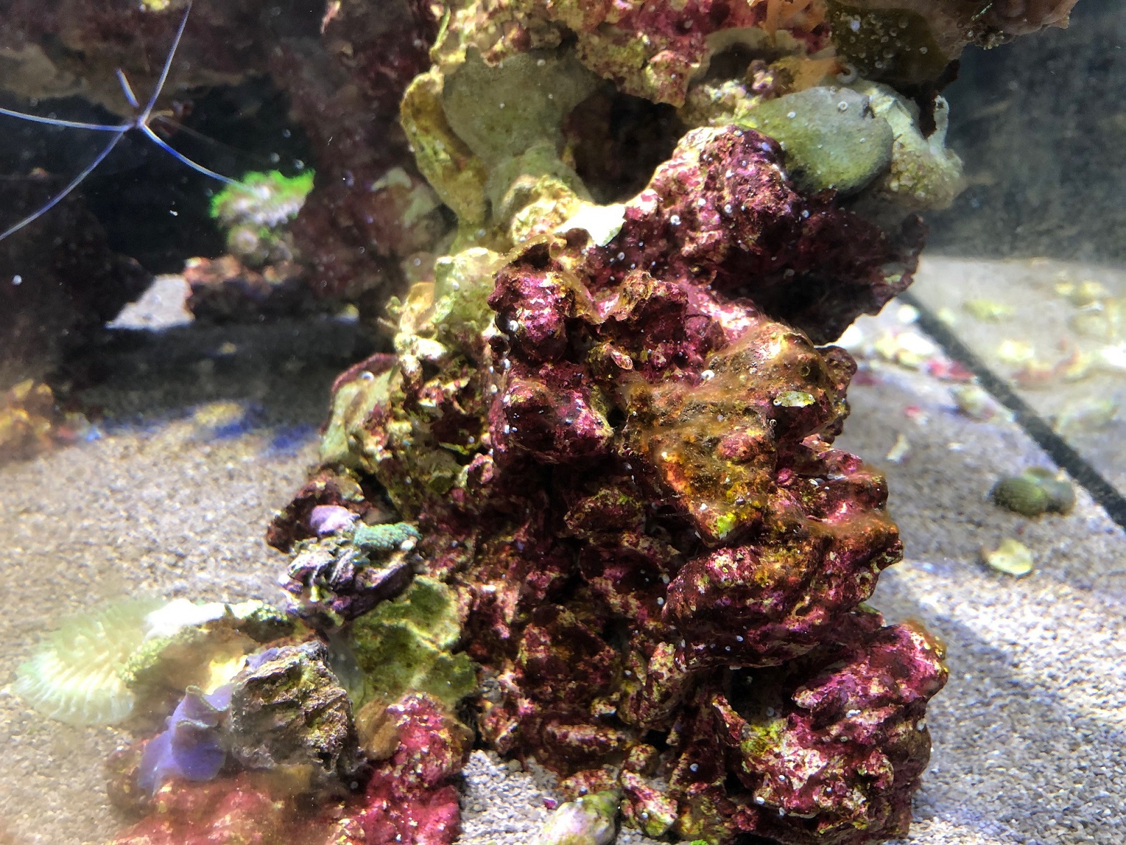 Die Dinos haben wir so "extrem" seit ca. 2 Wochen, davor waren immer nur vereinzelt Beläge zu sehen, meistens eher nach dem neue Korallen eingesetzt wurden, wir haben das auf den Stress und die Beleuchtungsumstellung der Korallen zurückgeführt. (muss man hier die Lampe immer etwas herunterfahren, wenn neue Korallen einziehen?)