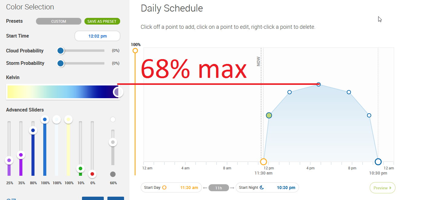 Der Kanal ganz links ist UV (25%) und der daneben violett (35%). Auf wieviel Prozent sollte ich diese stellen? Wie schnell kann ich die herunter regeln? Man muss bei der Lampe beachten, dass die 25% bzw. 35% sich auf die maximale Gesamtleistung, in meinem Fall auf 68% beziehen (im Tageshöchststand).
