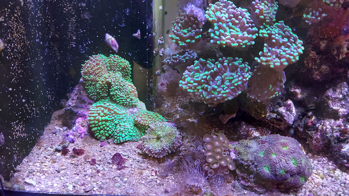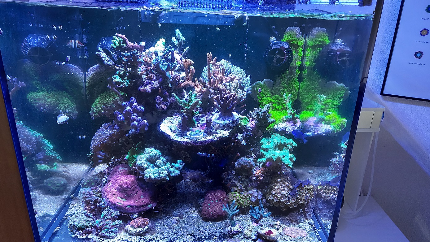 Aktuell habe ich seit ca. 3 Jahren ein Reefer 170. Eingerichtet ist es mir RRR und etwas Fiji Sand. Vielen Korallen, zwei Riffbarsche, eine Scherengarnele, Mithrax Krabbe und gefühlt einer Milion kleinen Schnecken.