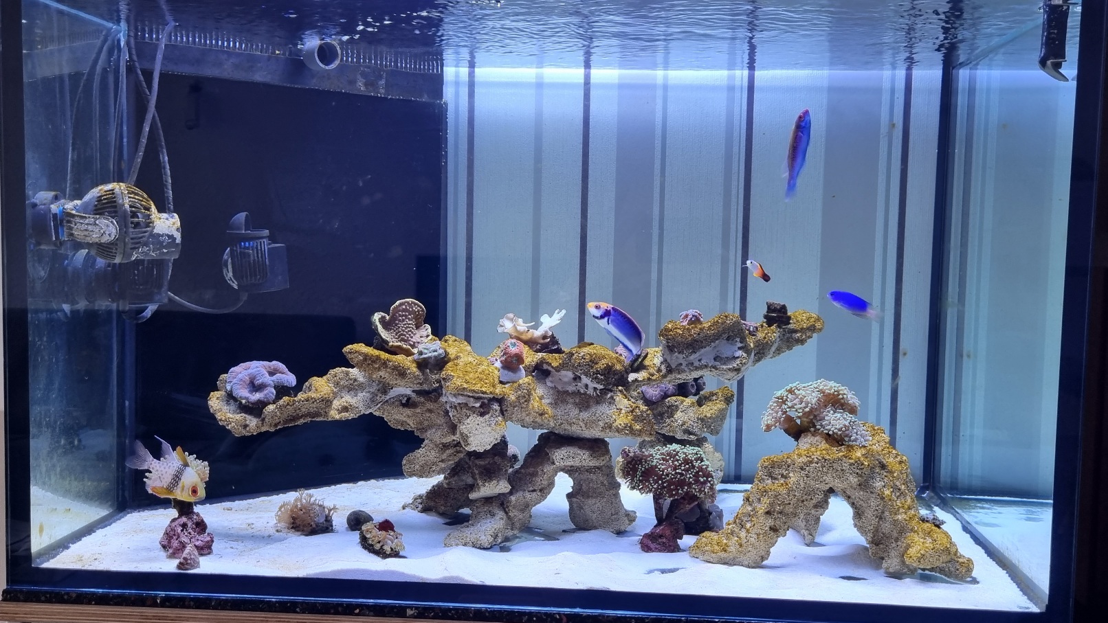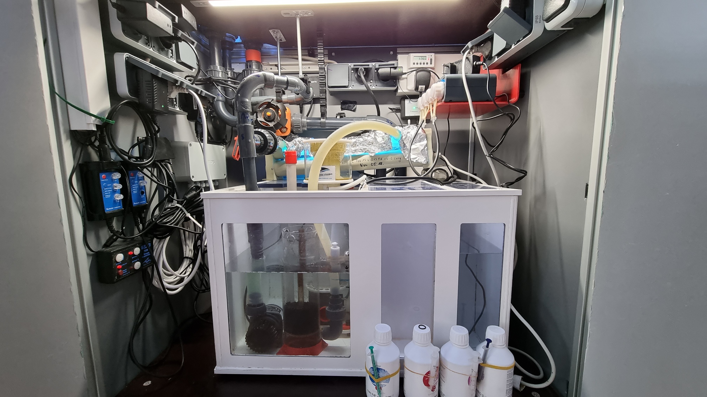 Technikbecken habe ich aus Kunstoff selber geschweißt. Das Wasser wird über eine Filtersocke zum Abschäumer geleitet. Im Technikbecken läuft auch der Kohlefilter den ich auch selbst gebaut habe. Ich werde mal ein Foto von dem Technikbecken machen. Zurück läuft das Wasser per Jebao DCP absolut lautlos. Dort ist auch eine Bypass-Möglichkeit für die Uv-Lampe nebst Kohlefilter. Für den zukünftigen Verbrauch an Ca und Na steht eine Dosierpumpe bereit. Das ist momentan allerdings noch gering. Ich denke das wird Anfang nächster Woche laufen. Erst müssen noch mehr Korallen rein. Leider sind mir durch den schnellen Abbau durch den Wasserschaden viele Tiere verstorben. Momentan fehlt durch den Neubeginn die Kohle in schöne Ableger zu investieren.