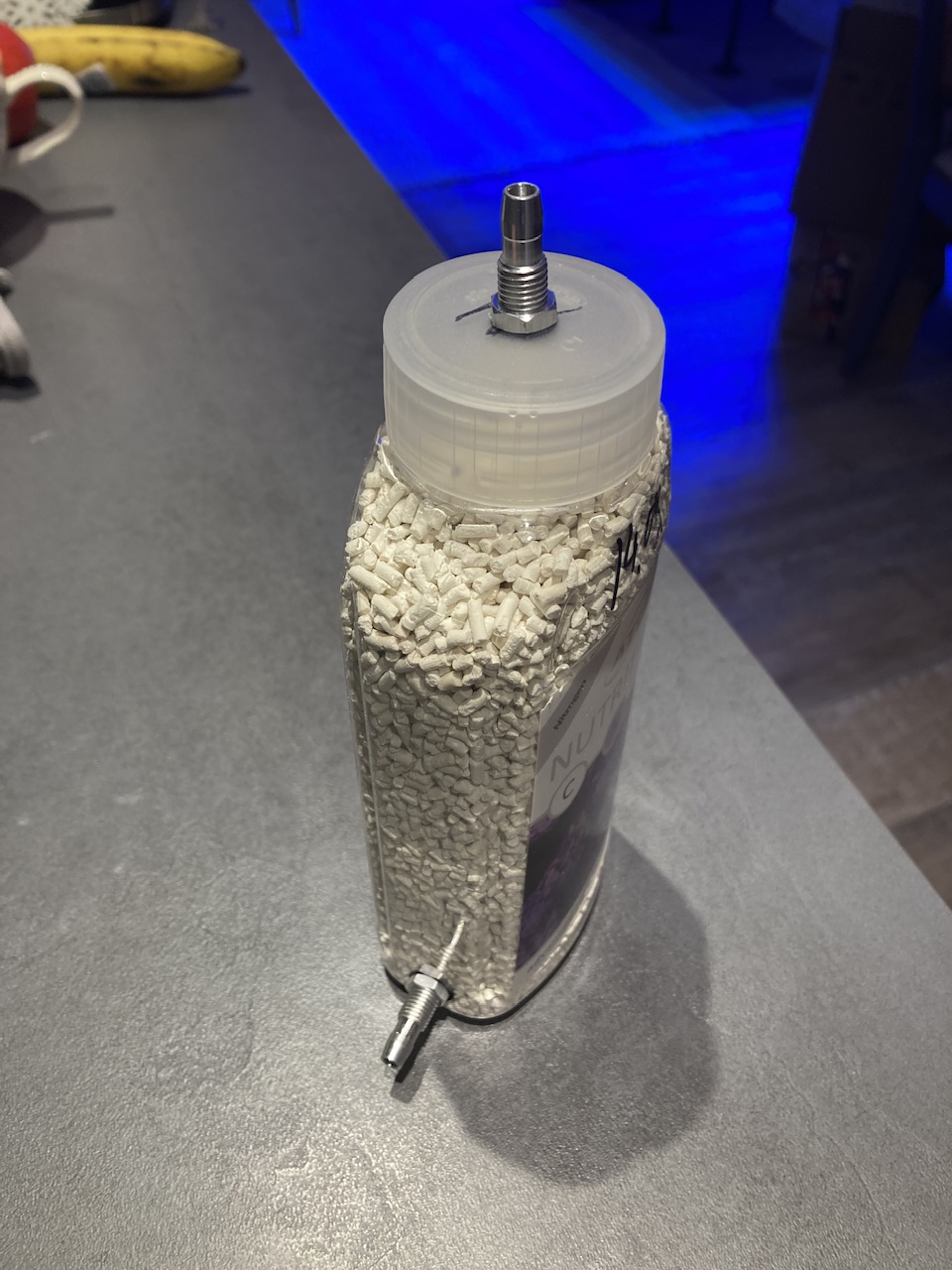 Mal aber zum ph-Wert. Da vor allem im Winter das Problem mit erhöhten CO2 Werten in der Wohnung einige zu kämpfen haben, so auch ich. Beschloss ich Atemkalk einzusetzen…da ich aber einen Holzausströmer mit einer Luftpumpe verwende, kann ich keinen klassischen Atemkalkfilter nehmen…also kurz überlegt, zwei kleine 6 mm Schlauchanschlüsse (Kart-Zubehör) gekauft und ne leere 500 ml Kunststoffdose genommen.
