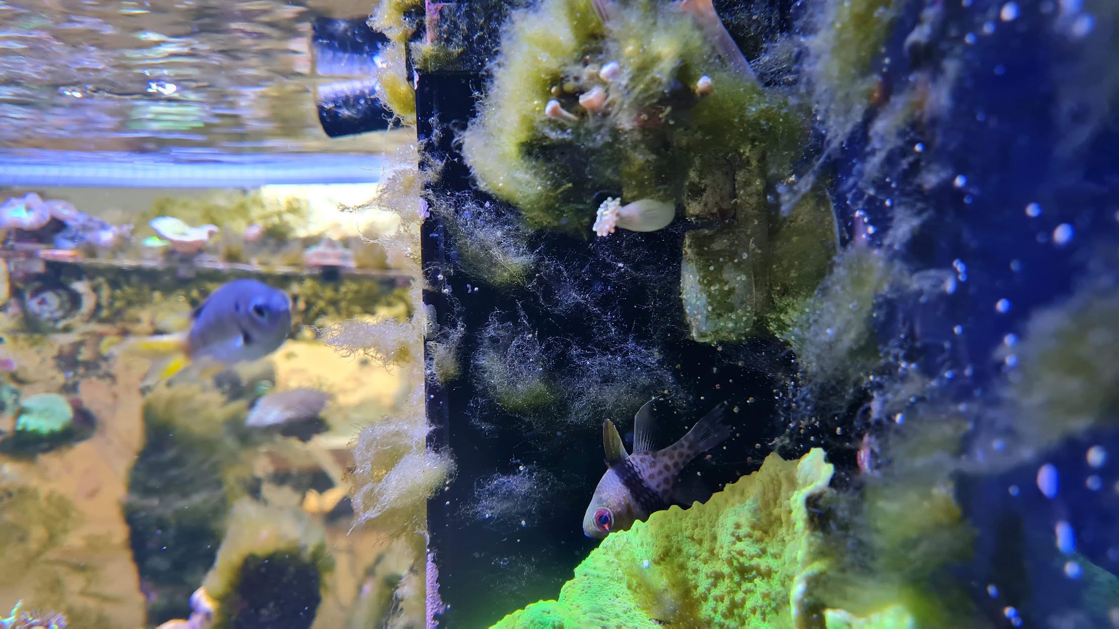 Nach dem Umzug vom 120er auf das 250er ist das Becken erstmal super da gestanden. Nach ein paar Monaten habe ich den Aufbau dann mit einer Säule aus Carib Sea Branch Steinen erweitert. Ab da ging es mit den Problemen los. Mir hat es vermutlich den Nährstoffhaushalt zerschossen. Dadurch sind ein paar Korallen abgestorben. Vor allem ein großer Stock Montipora. Das hat eine Kettenreaktion verursacht. Die ausgestoßenen Zooxanthellen haben dann zu einer Dino Plage geführt.