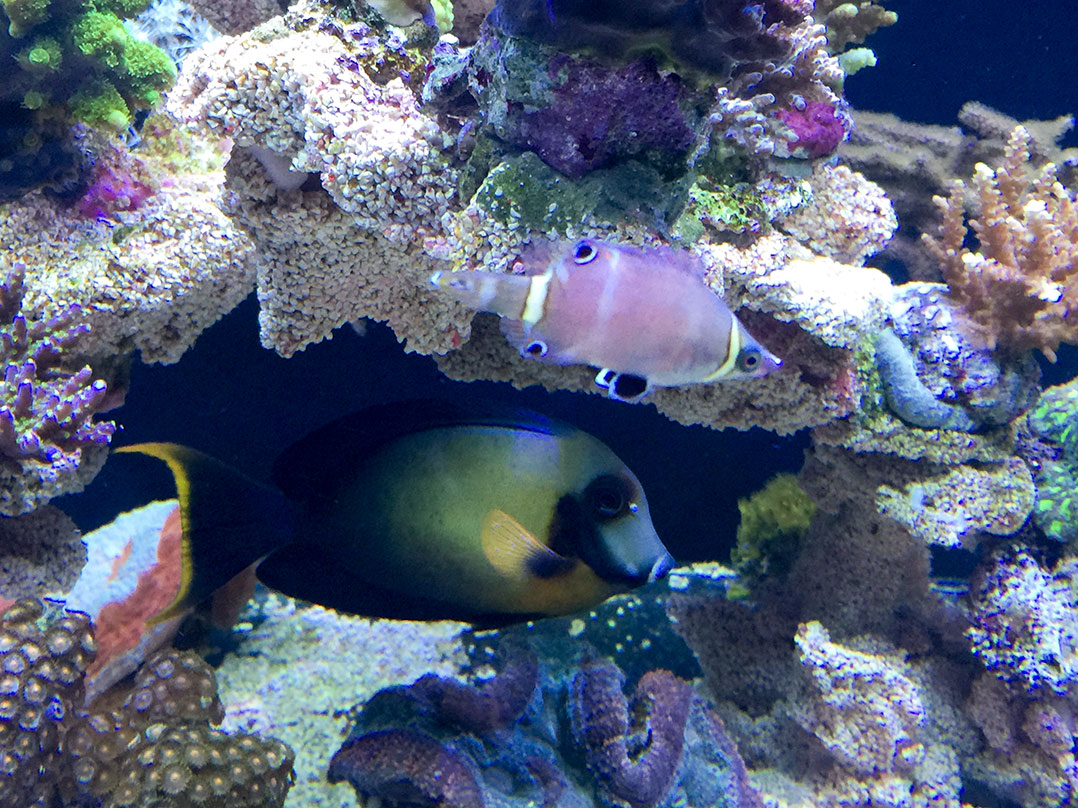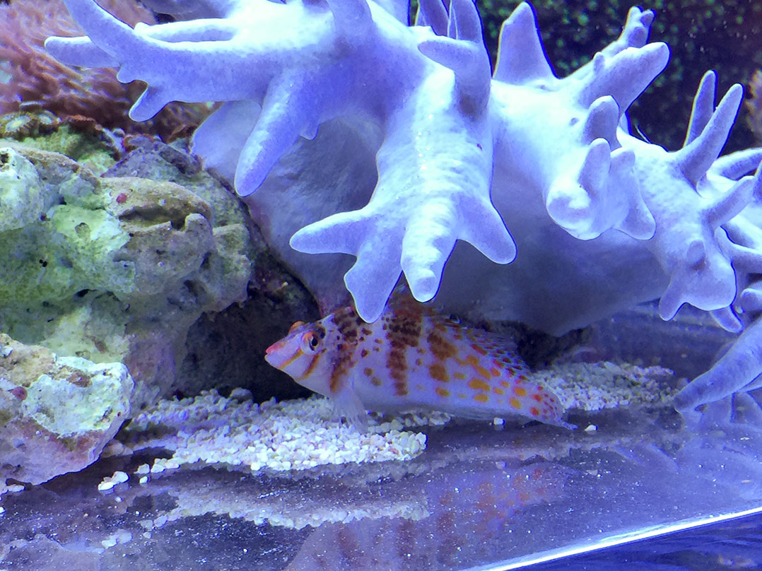 Ein weiterer Neuzugang sind drei Chromis und ein Cirrhitichthys falco (Korallenwächter).