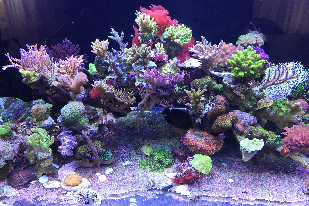 Ansonsten gibt es nicht viel zu berichten, hie und da a bisserl Korallen aufgestockt und umgestellt, ein paar Riffäste verbaut. Die letzten Wochen über wächst bei mir ziemlich viel Meersalat, eine Art Ulva, nur in rot. Die Teile sind teilweise so groß geworden, dass ich sie kappen musste und hab sie an die Seitenwand mit einem Magneten befestigt. Schaut ja eigentlich sehr dekorativ aus, aber wenn die Korallen immer abgeschattet sind....