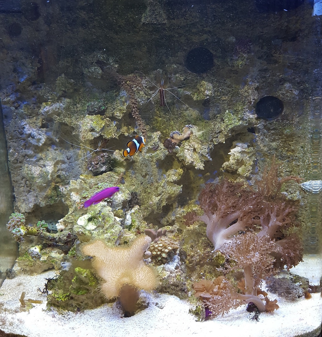 Die neuen Tiere, habe sich bis auf eins gut eingelebt. Die Anemone ist mehrfach hintereinander immer wieder Richtung Ablauf gewandert. Immer wieder habe ich sie umgesetzt, die Pumpenleistung reduziert usw. Irgendwann in der Nacht hat es dann geklappt... Das Becken hat den Unfall aber sehr gut überstanden. Wie es die Anemonen schaffen, sich durch einen 0,5 - 0,7 cm großen Spalt zu zwängen, ist mir echt schleierhaft, eventuell liegt es an den Fadenalgen, die manchmal in den Ablaufsieben hängen und dadurch den Sog an den freien Stellen erhöhen.