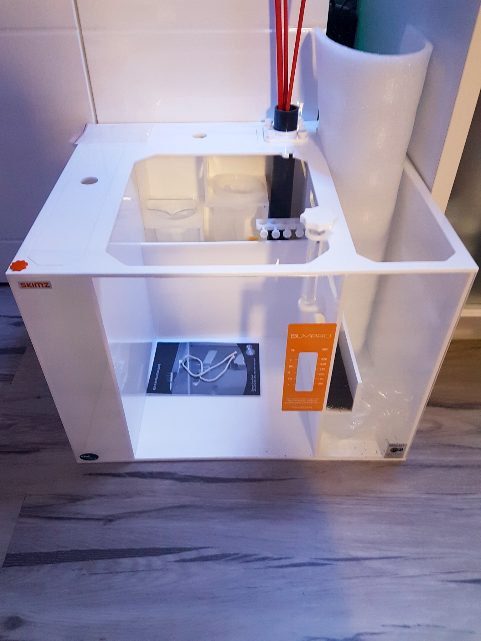 Es hat Halterungen für Elektroden und Dosierpumpenschläuche sowie einen justierbaren Wasserstand in der Abschäumerkammer.