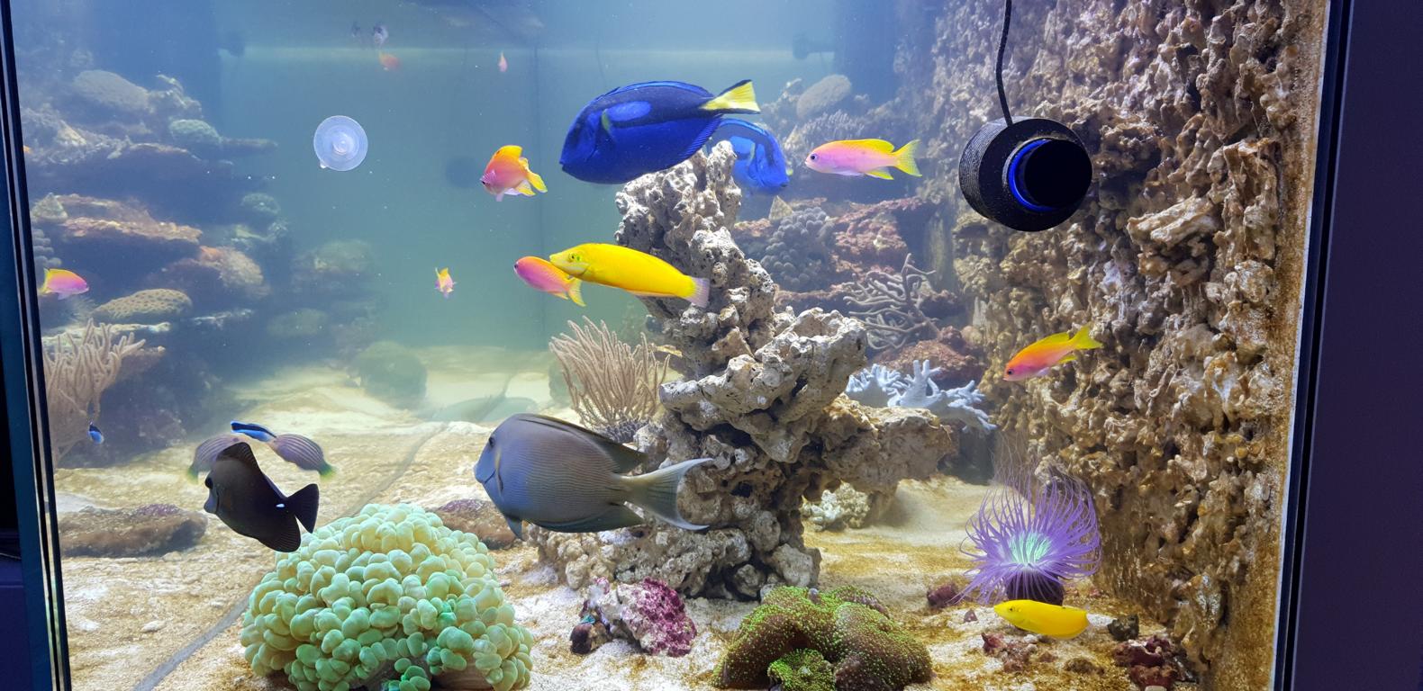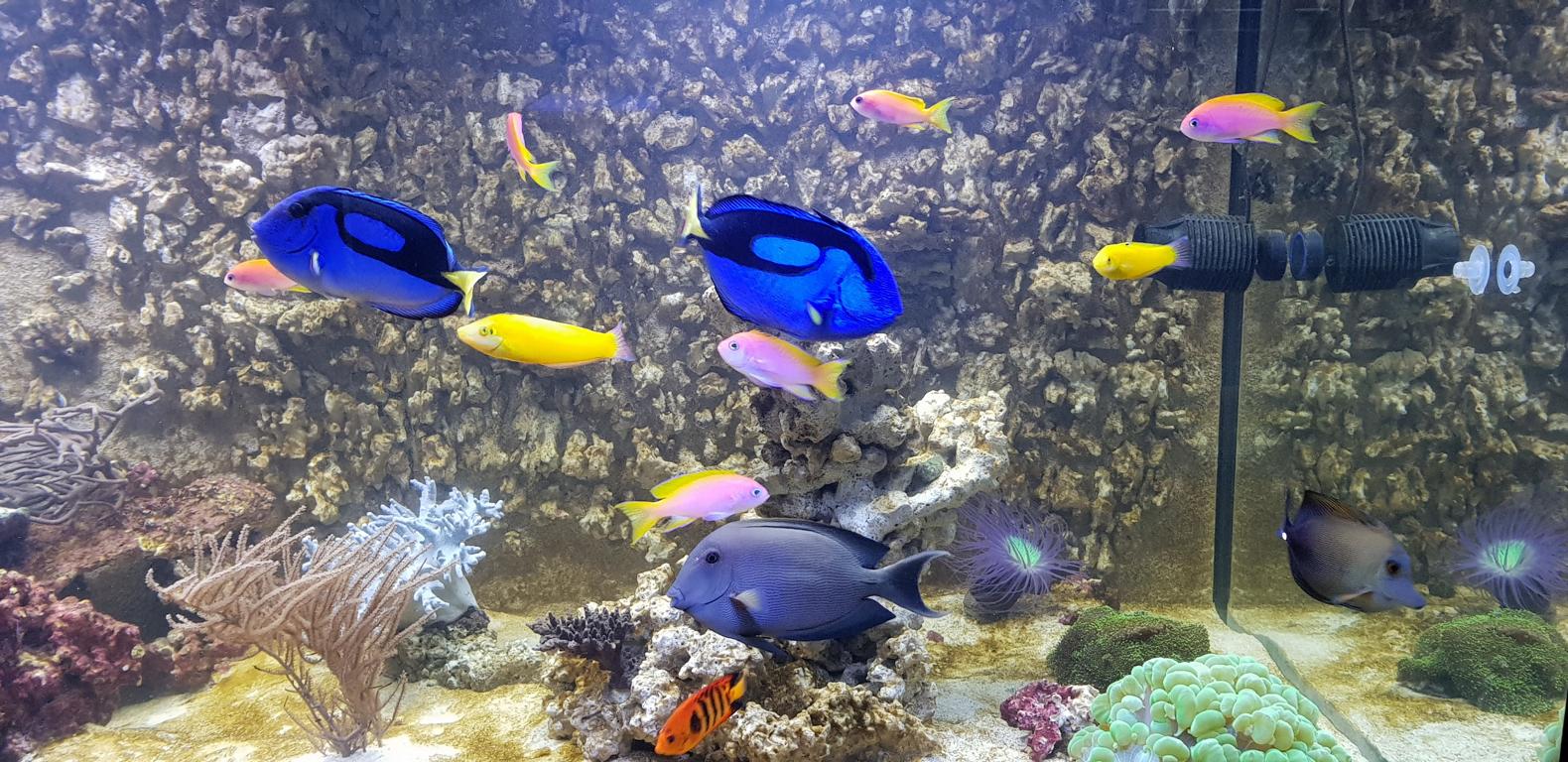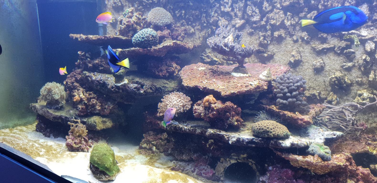 Im Gegenzug muss ich selbstverständlich auf eine ausreichende Nährstoffversorgung achten. Klar ist auch, dass ein Becken mit wenig(er) Dekorationsoberfläche unterumständen einfacher zu fahren ist als eines mit mehr Oberfläche. Dieser Punkt ist auf dem Radar und wird permanent unter Kontrolle gehalten. Ich wollte auf keinen Fall ein optisch zu steriles Becken, ich wollte eines wo sich die Tiere wohl fühlen und ich es für schön empfinde (zweites ist ja bekanntlich Ansichtssache). Bis jetzt sieht es für die Tiere gut aus, viele Einsiedler, Schnecken und Seeigel sind davon begeistert. Auch der Borsti hat gefallen daran und der Putzerlippfisch und ein paar Anthias schlafen sogar in der Rückwand.