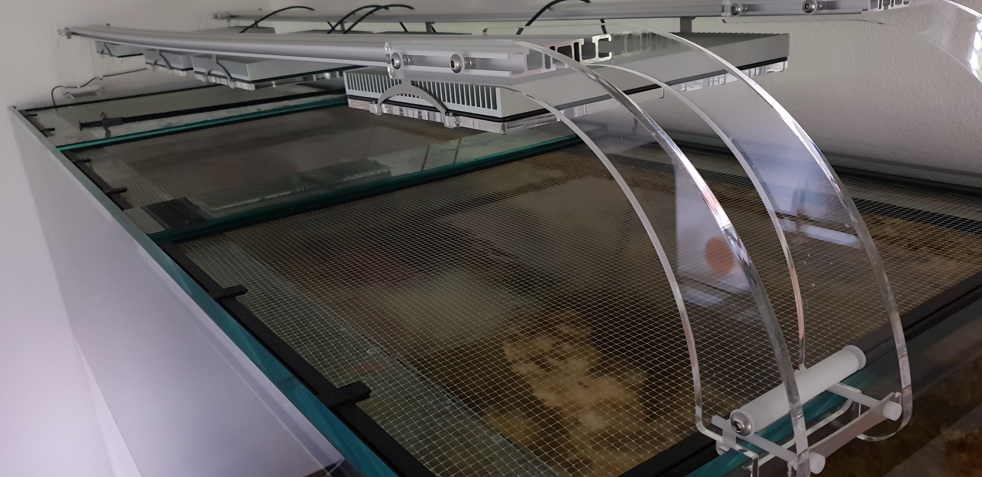 Als Schutz, damit unsere Muräne nicht auf den Gedanken kommt abhauen zu müssen, habe ich diese Netzabdeckung gebastelt. Da beim Aquarium oben kein Rand ist, besteht die Möglichkeit, dass auch mal ein springfreudiger Fisch rausspringen kann. Mit dieser Abdeckung ist auch dieses Problem behoben, lässt trotzdem das ganze Licht hindurch und die Luftzirkulation (Sauerstoff/Gase) ist auch gegeben.