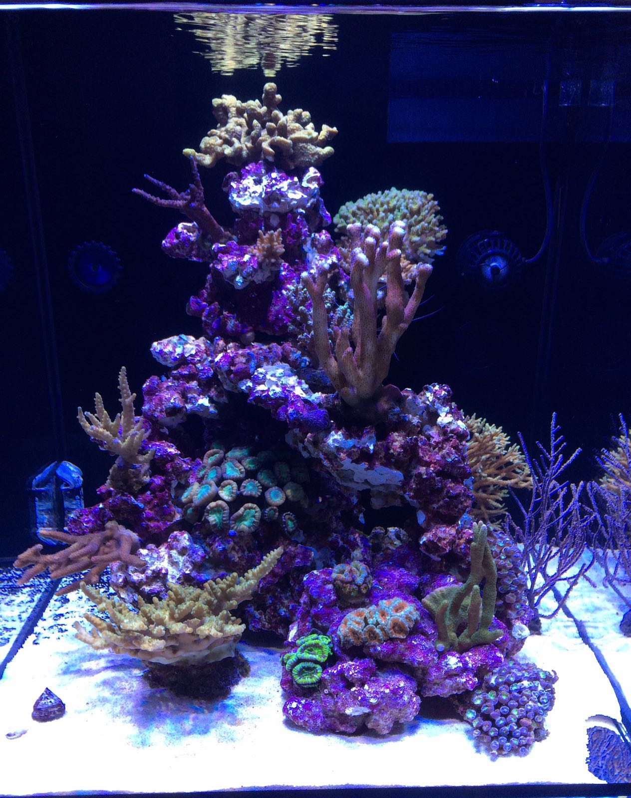 Hier mal das erste Bild vom Becken, die Korallen habe ich noch nicht geklebt da es noch nicht der entgültige Platz ist. So z.B. kommt die Stylophora noch nach vorne rechts unten, die gelbe Acropora am Boden noch aufs Riff usw. Ich möchte damit aber erst noch abwarten wie sich das Becken jetzt entwickelt, und dann erst die Korallen kleben, wenn der nächste Schwung an SPS einzieht. In der zwischenzeit Hände raus aus dem Becken