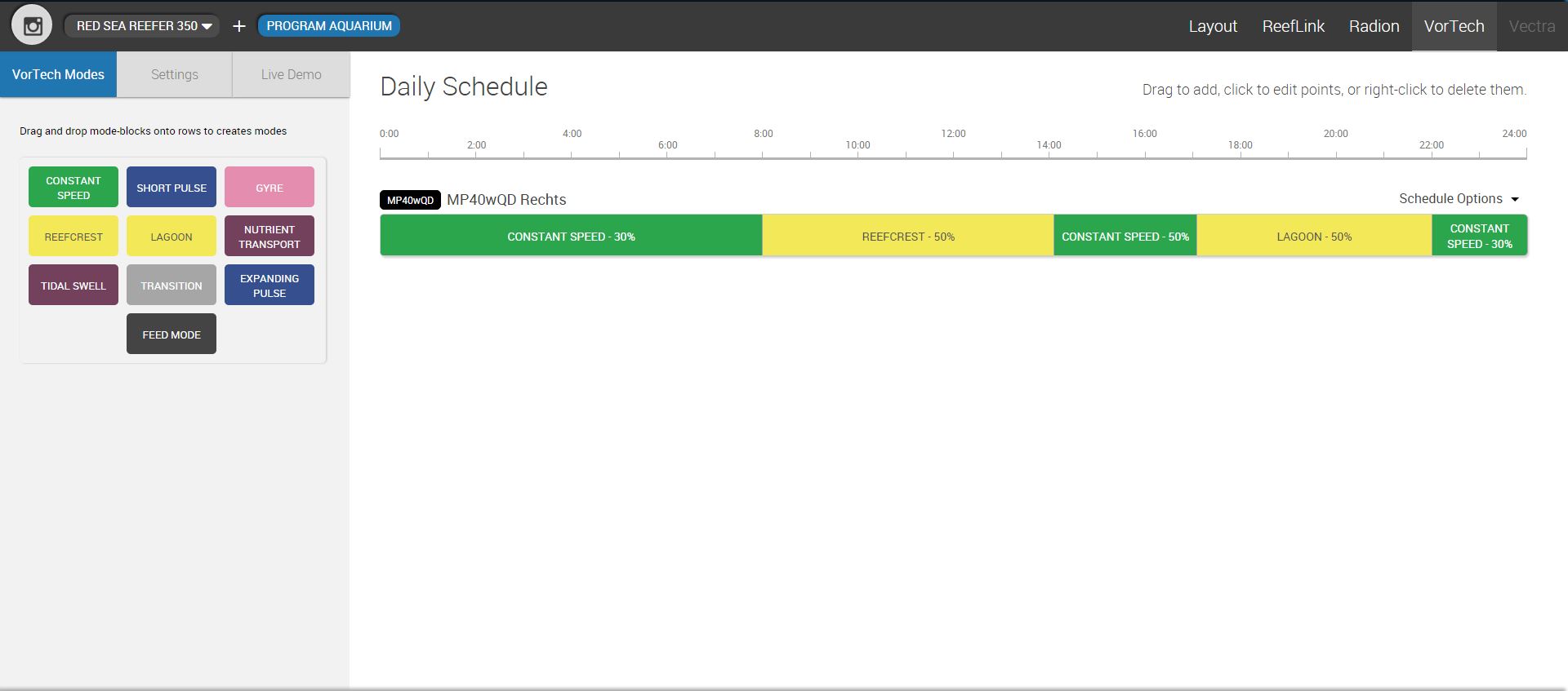 Ich betreibe die MP40wQD mit 50% ihrer Leistungsfähigkeit in verschiedenen Modi. Ich muss gestehen ich habe kaum etwas geändert und bin bei den von Ecotech vorgegebenen Programmen geblieben.