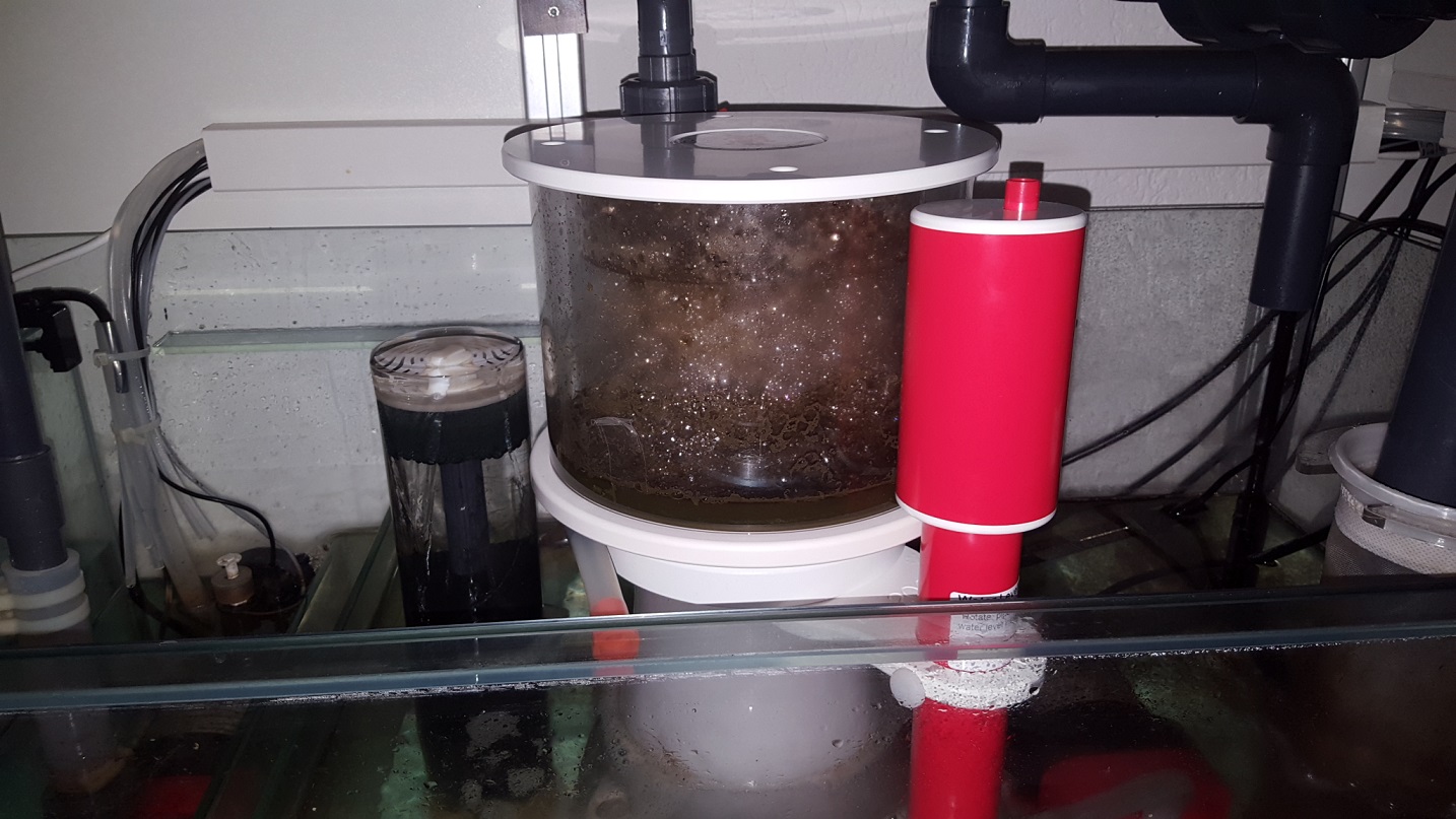 Der Abschäumer funktioniert mittlerweile gut und produziert festen Schaum. Der Schaum ist recht trocken aber nicht so trocken das sich der Becher damit auffüllt. Ich habe die Pumpe momentan auf 24W laufen, denke da muss ich mich ein bisschen herantasten.