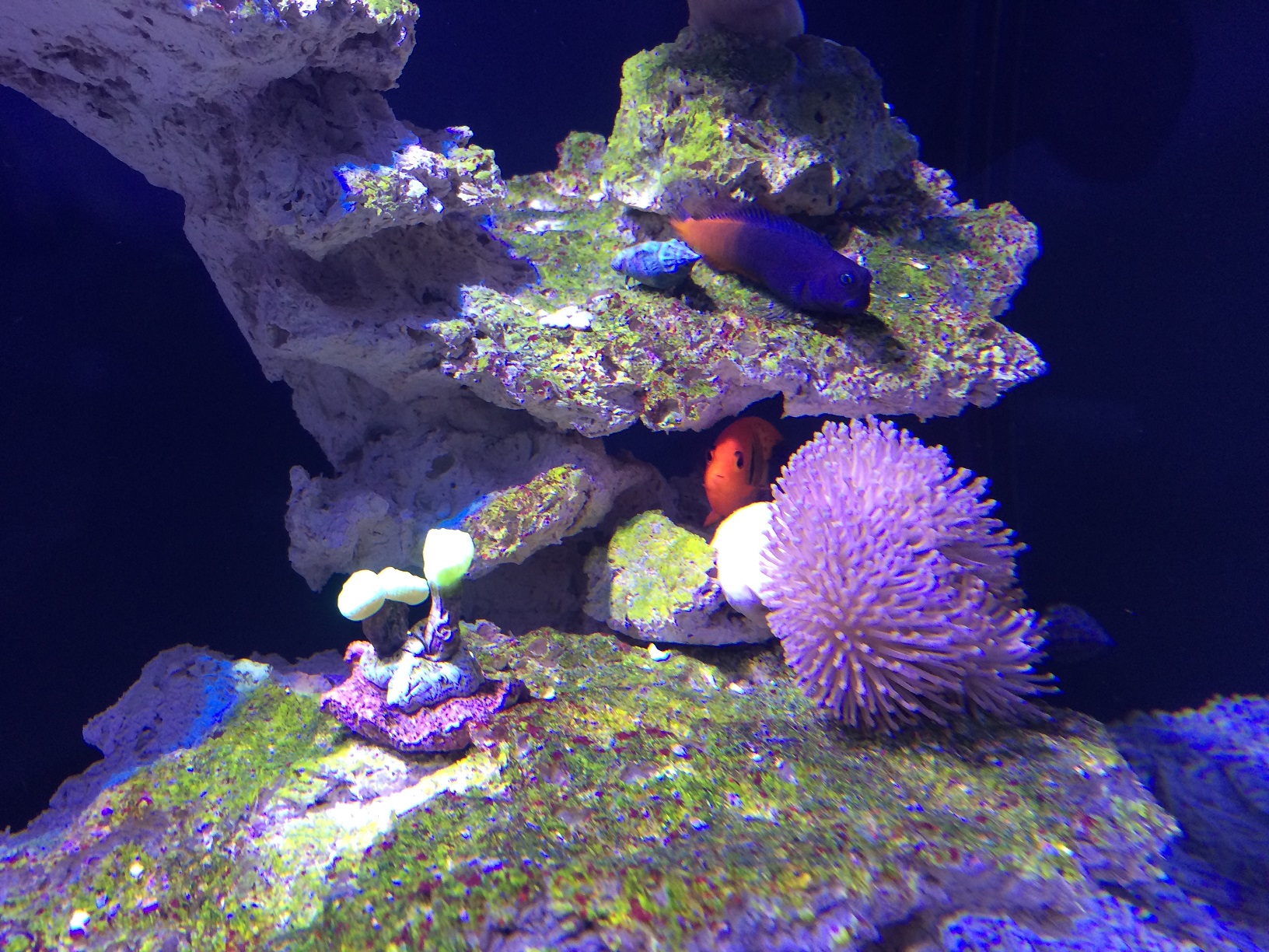 hier kommt eine aktuelle Ansicht von meinem Becken. Die Entwicklung geht weiter positiv voran und auch eins meiner Sorgenkinder (Seriatopora rechts neben Ablaufschacht) wächst und entwickelt sich.