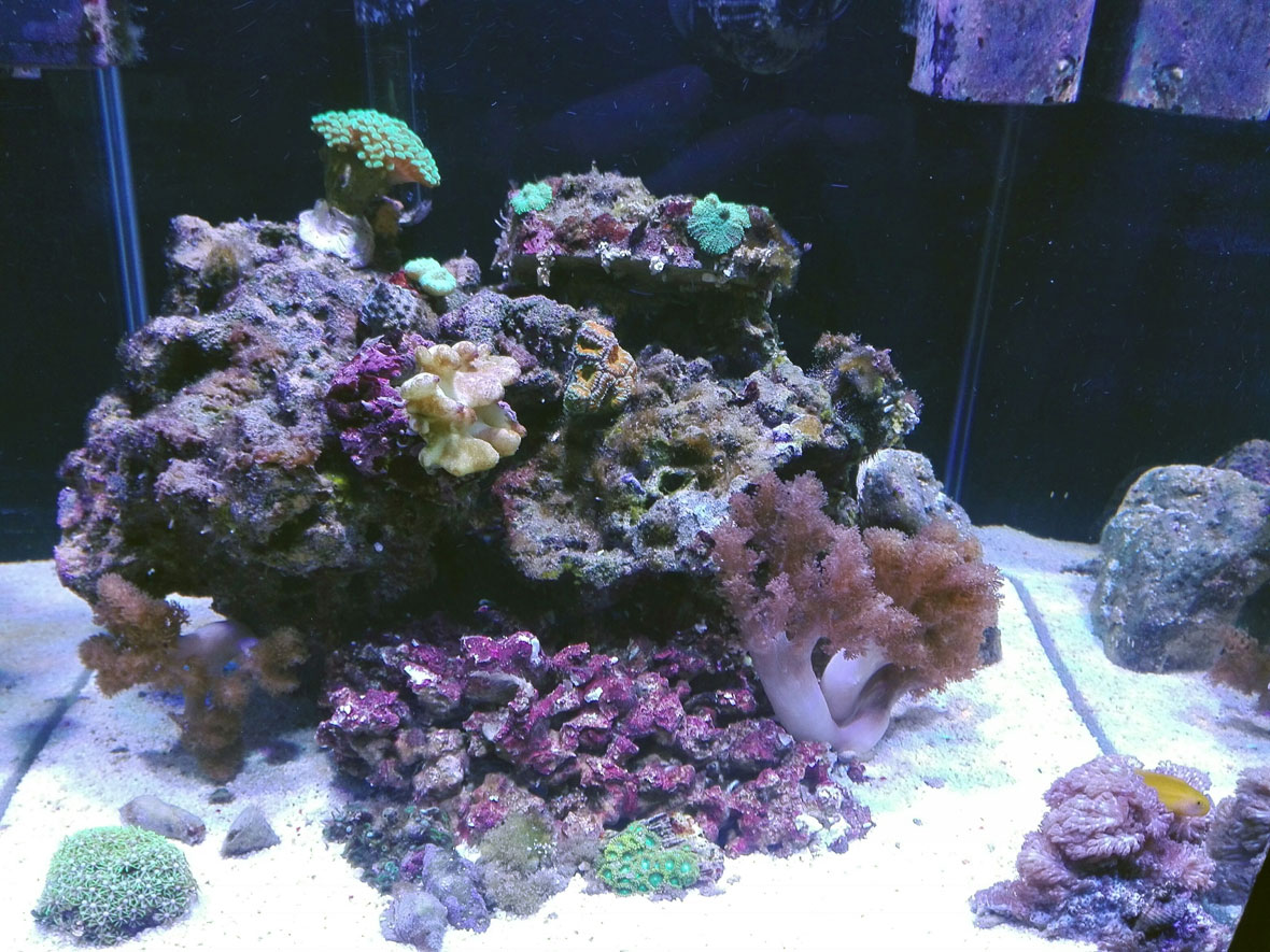 Ich habe versucht mit einem üblichen 54 Liter AQ wieder anzufangen, was auch einigermaßen funktionierte und ich erst wieder registrierte wie umfangreich dieser Bereich eigentlich ist. Habe anfänglich falsche Beleuchtung genutzt und etwas zu spät mit Sangokai "nutri-basic All-in-One" angefangen und auch hier Schwierigkeiten mit meinen Wasserwerten und ein paar Korallen bekommen.