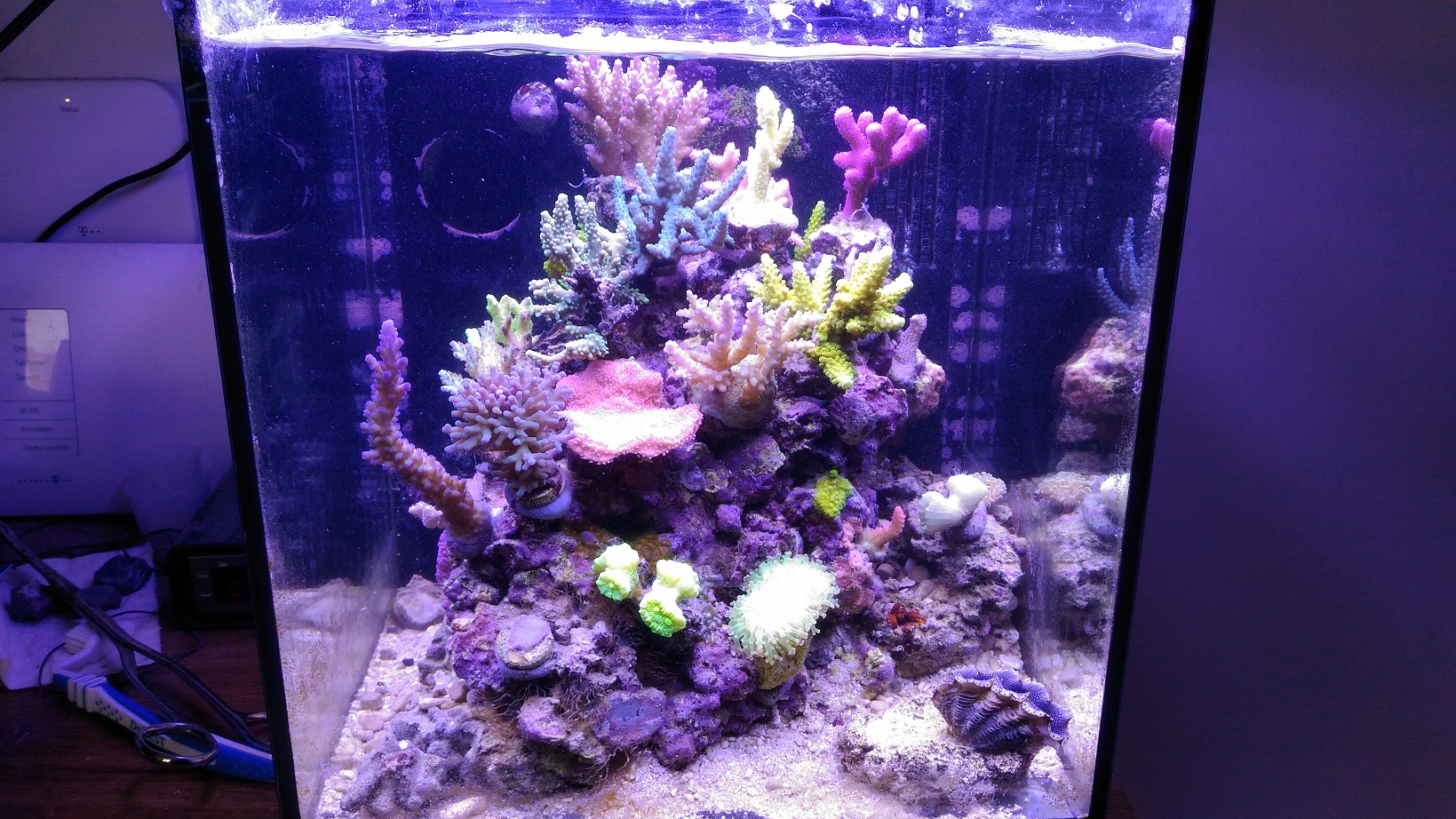 Mein Becken ist das AquaMedic Yasha mit 37l Brutto und 26l Netto. Das Becken wurde am Silvester 2015/2016 gestartet und ist mein erstes Meerwasserbecken. Ziel war es von Anfang an SPS-Korallen zu halten, was nicht immer gut ging. Ich habe mir nach Fehlschlägen immer überlegt, warum die Korallen nicht gesund sind und daraufhin Technik optimiert. Meine Lampe ist beispielsweise bereits die vierte Version, den Abschäumer kann ich euch x mal zusammenbauen, in allen erdenklichen Version, usw. Ich bin auch vor einem halben Jahr auf Sangokai umgestiegen, was auch Besserung bracht und bin auch dabei geblieben und hab sogar die Produktpalette erweitert.
