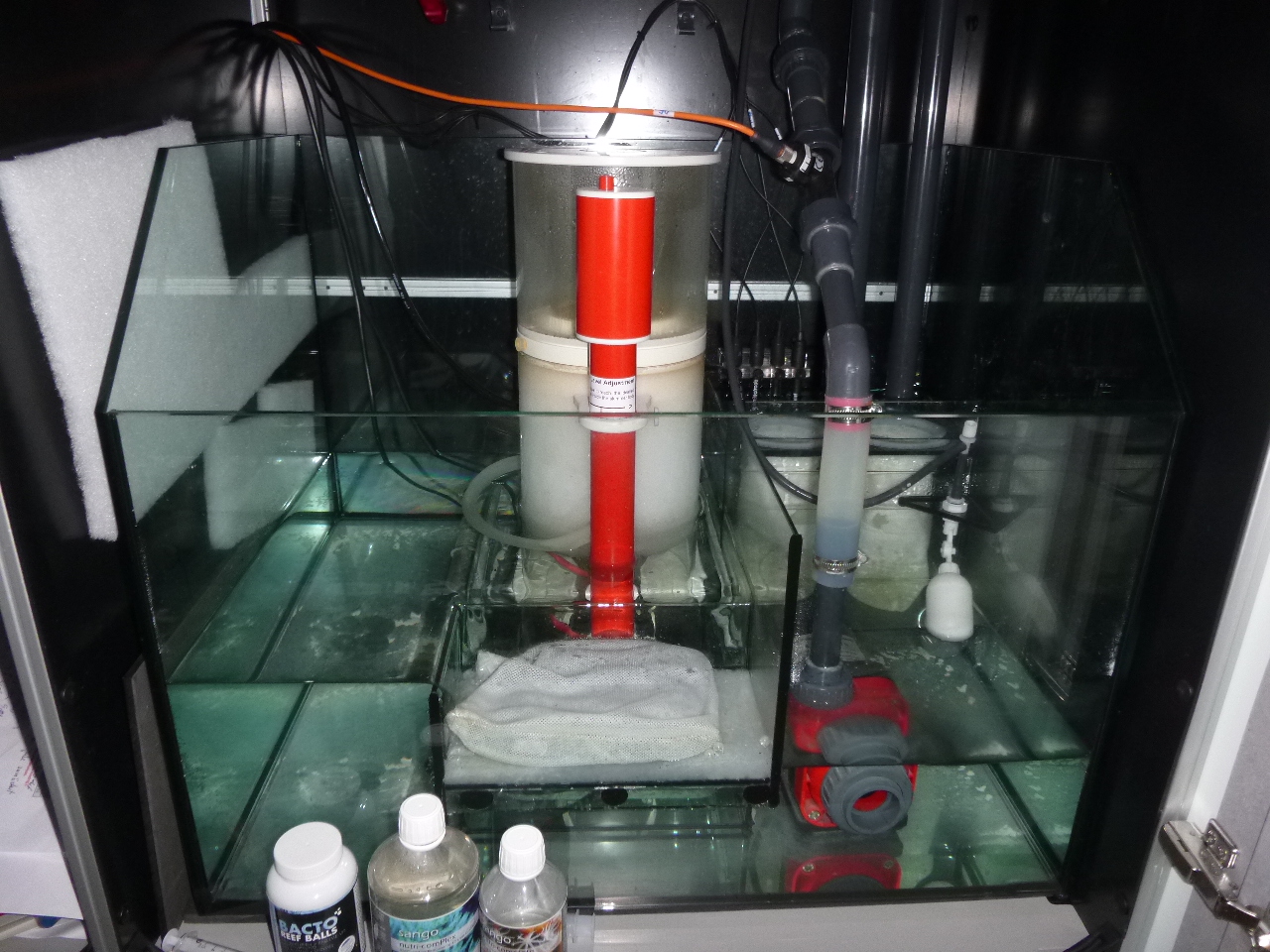Der Vorbesitzer ersetzte die "Haustechnik" durch Royal Exklusiv Teile. Also Abschäumer und Rückförderpumpe. Aus genannter Hitzeangst ersetzte ich die T5 Beleuchtung durch 2 GHL Mitras 7206. Außerdem baute ich den Unterschrank so um, dass ich linksseitig zusätzlichen Raum habe. Darin sind GHL Profilux 4 und 2 Dosierpumpen und die zugehörigen Behälter. Dosiert werden soll mit denen Sangokai Balance und Basis.