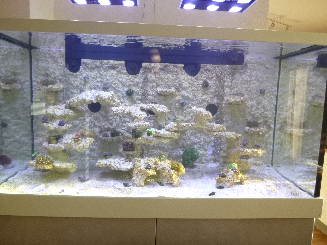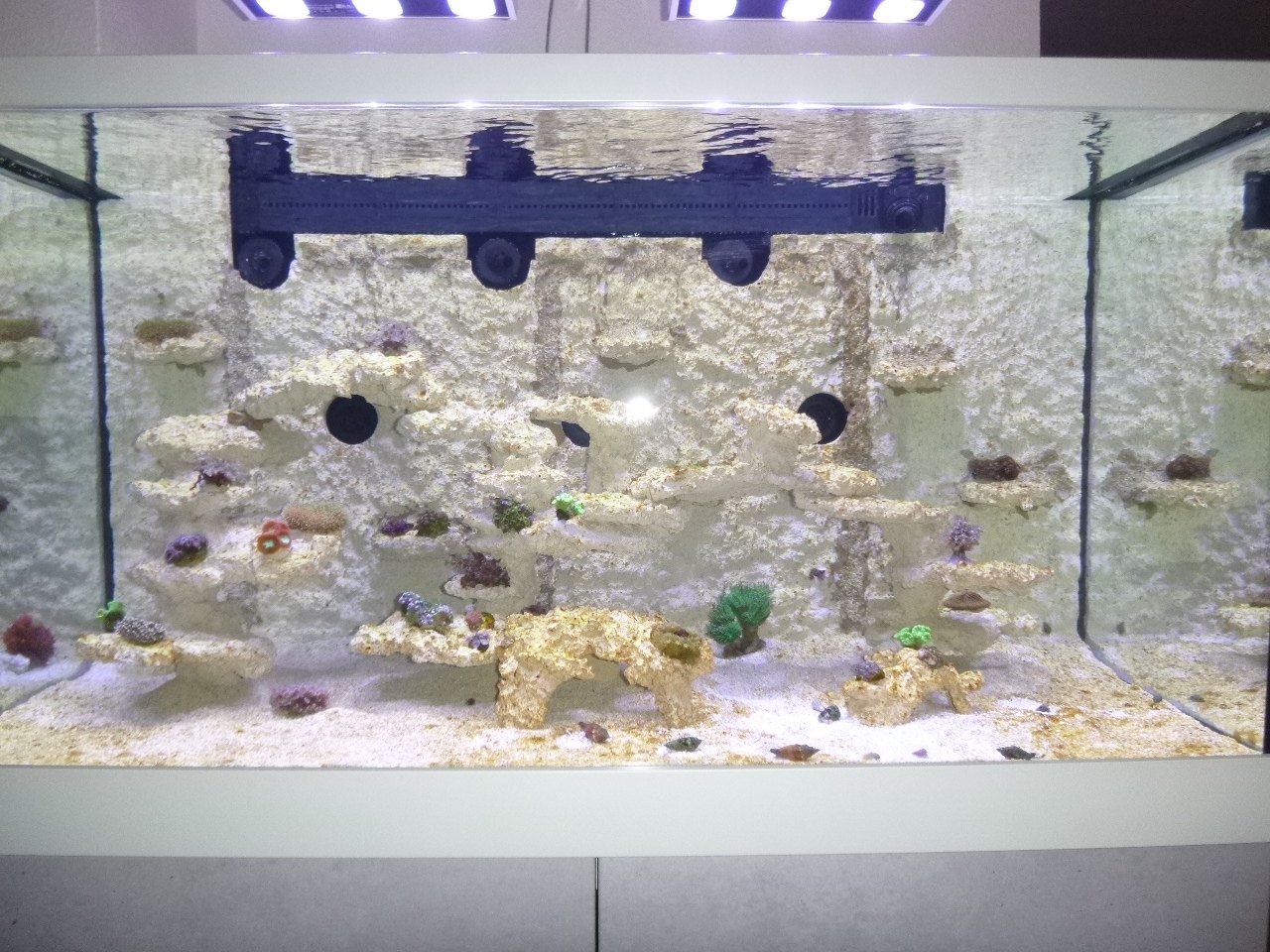 Auch das Thema "zügig besetzen" habe ich in einem anderen Beitrag angesprochen. Hier habe ich inzwischen 24 meist sehr kleine Ableger diverser LPS, Weich- und Röhrenkorallen, sowie Zoanthus und eine Entacmea.