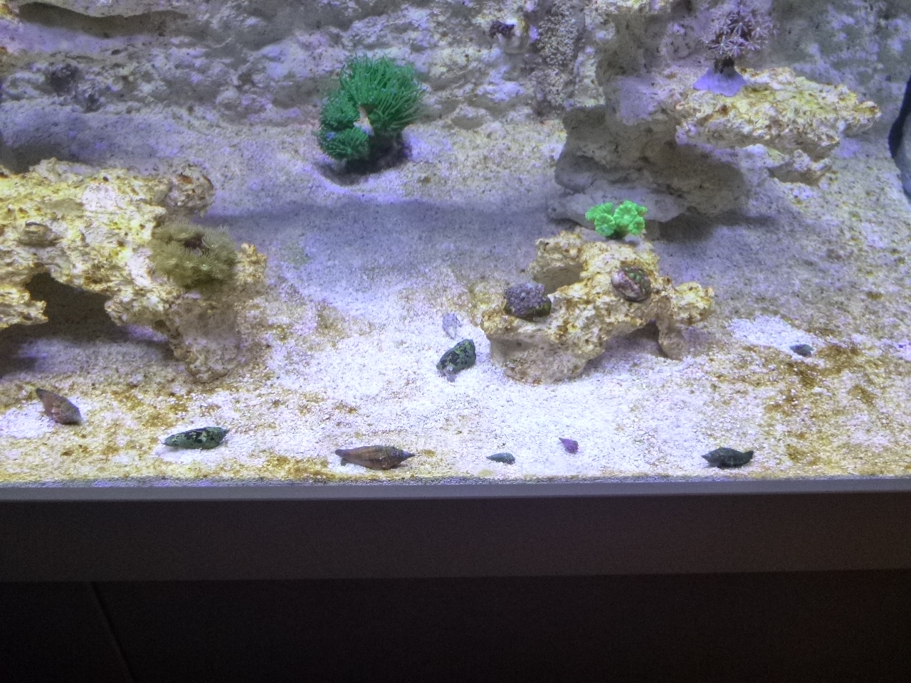 Jedenfalls bin ich zügig am Besetzen. Gestern kamen 3 LPS, diesmal größere Tiere und eine Zoanthus dazu. Außerdem habe ich 4 Schnecken und 7 kleine Einsiedler zu Tisch gebeten - sollen die sich doch um den hässlichen Belag kümmern...