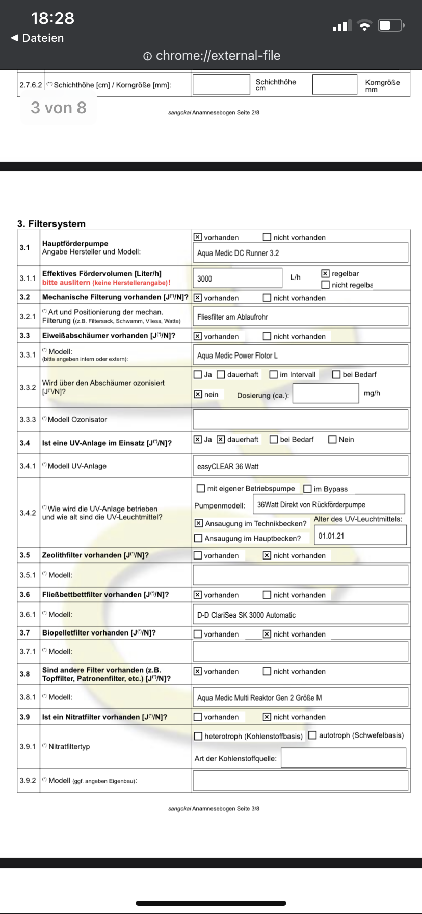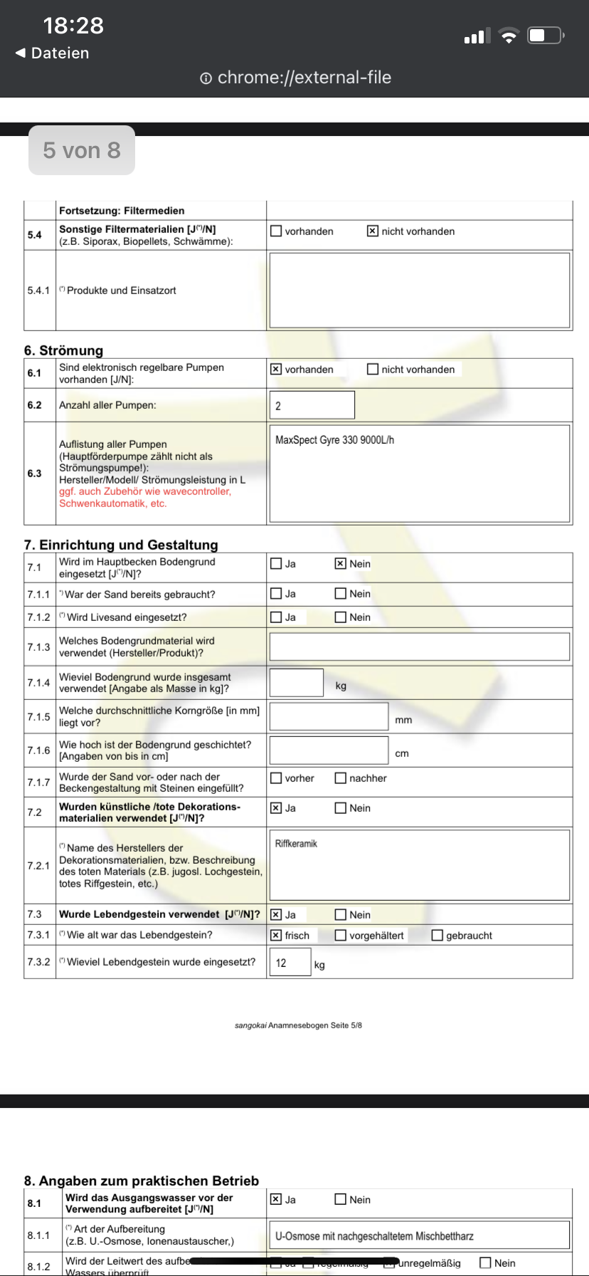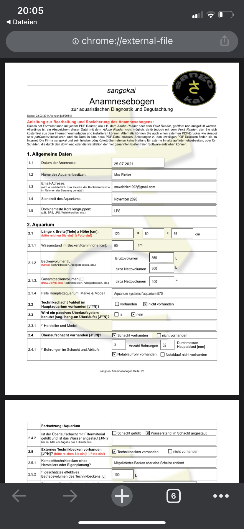 Eine aktuelle Analyse sowie der Anamnese Bogen ist beigefügt. In der Hoffnung das dieser passend ausgefüllt ist. Versorgen tue ich das Aquarium seit 4 Tagen mit dem Sangokai System nach dem Versorgungsplan. Die Hauptversorgung mache ich über Balling Light. Die Traces sind nach Anleitung zugemischt.