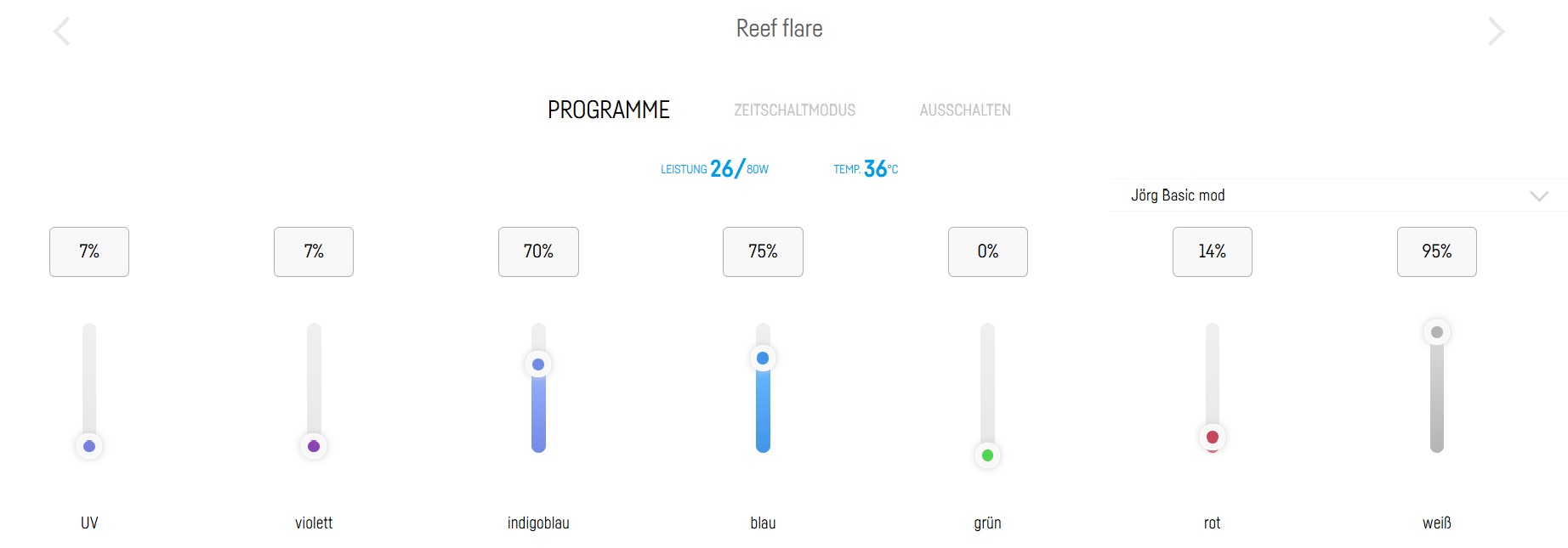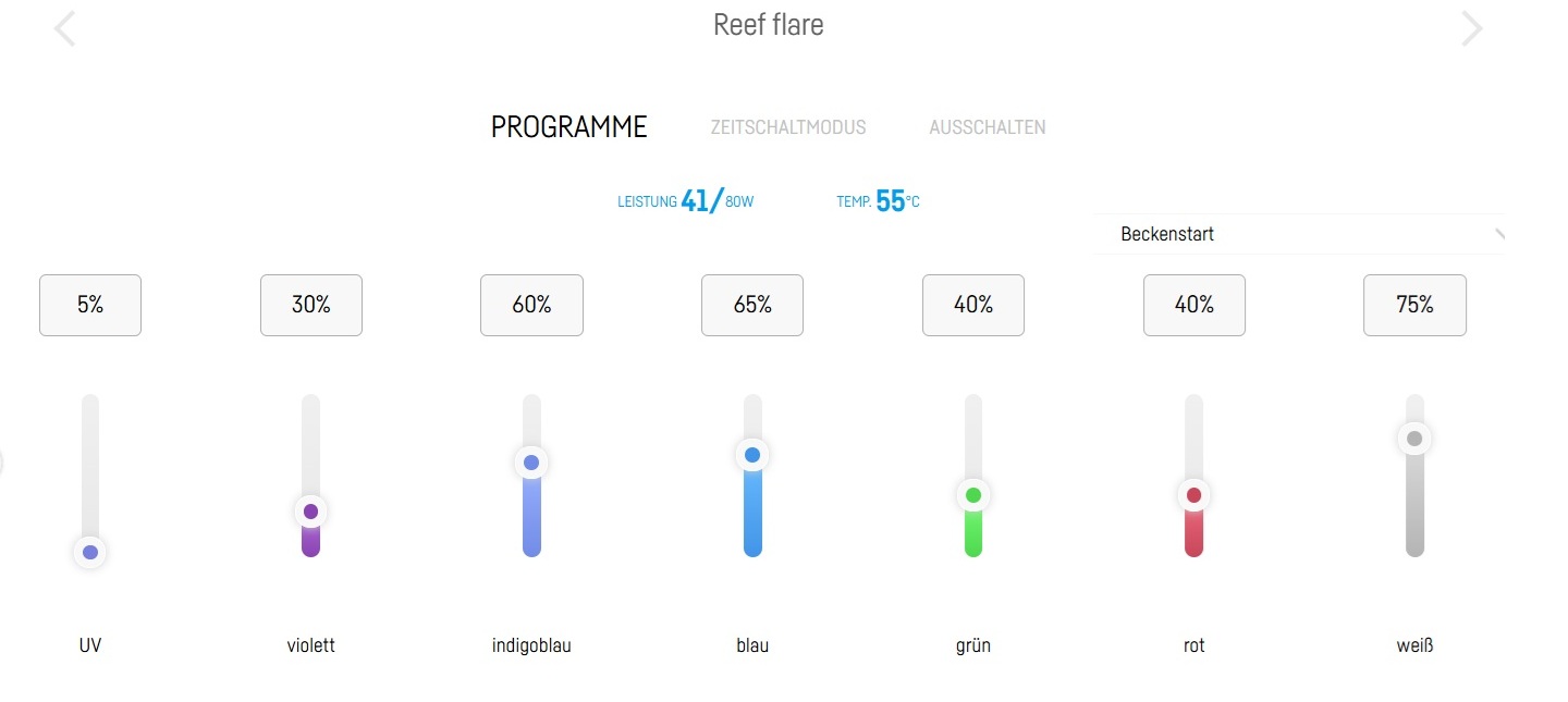 Ich habe die Reef Flare Pro S von Reef Factory und für den Start ein Beleuchtungsprogram mit sehr wenig UV und Violett, ein bisschen höheren Blauanteil allerdings auch noch stark reduziert, so gut wie kein Rot und Grün und. Meine Einstellung sehen zum Beleuchtungshöhepunkt so aus.