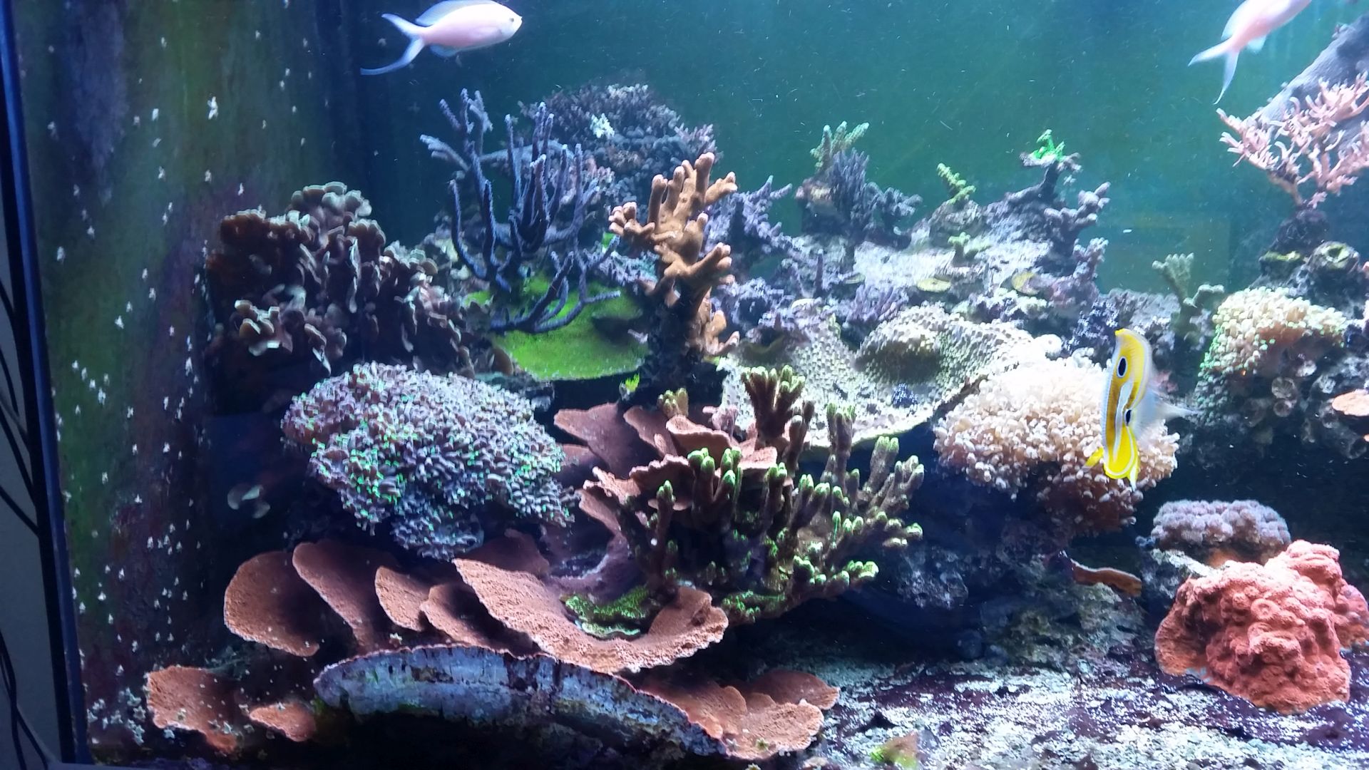 Insgesamt muss ich aber auch ehrlich sagen, dass das Becken sehr dicht und kompakt gebaut ist und zudem auch stark verwachsen ist. Die rote Montipora links stört die Strömungsausbreitung extrem und schön sieht es so auch denke ich nicht aus. Ich würde also auch etwas Gärtnern um die linke Seite für Strömung wieder zugänglich zu machen.