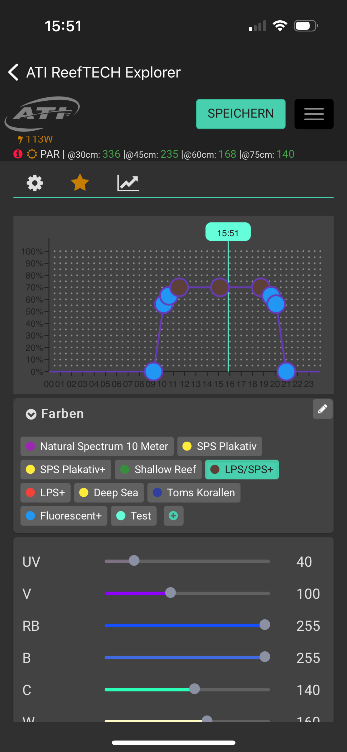 Die Lampe hast Du jetzt neu, verstehe ich richtig oder? UV würde ich erst mal auf 20 senken, und wie gesagt, steigern kannst Du immer noch, aber ich würde die Intensität so wirklich erst mal testen und gucken, wie die Korallen reagieren. Ich hätte vermutlich erst mal nur bei 60% in der Tagesmaximalleistung angefangen. Es geht nicht nur um die Intensität oder ums Spektrum, sondern v.a. auch darum, wie das Licht auf die Korallen fällt. Und das braucht Zeit zur Akklimatisation.