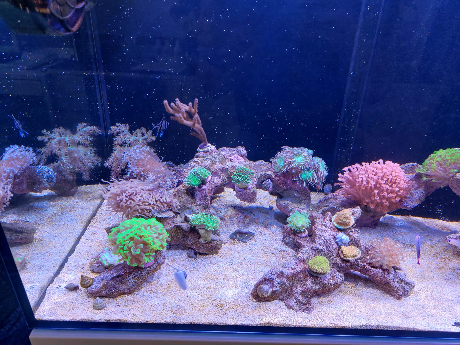 Mir sind Deine Tiere zu hell. Ich würde regelmäßiger Nährstoffe geben. Mit der Lampe kenne ich mich nicht aus. Aber scheint recht viel zu sein an Licht. Wenn Du viel Licht hast, musst Du gut versorgen. Fährst schnell Auto, brauchst mehr Sprit. Dein Bodengrund bekommt auch Farbe oder…?