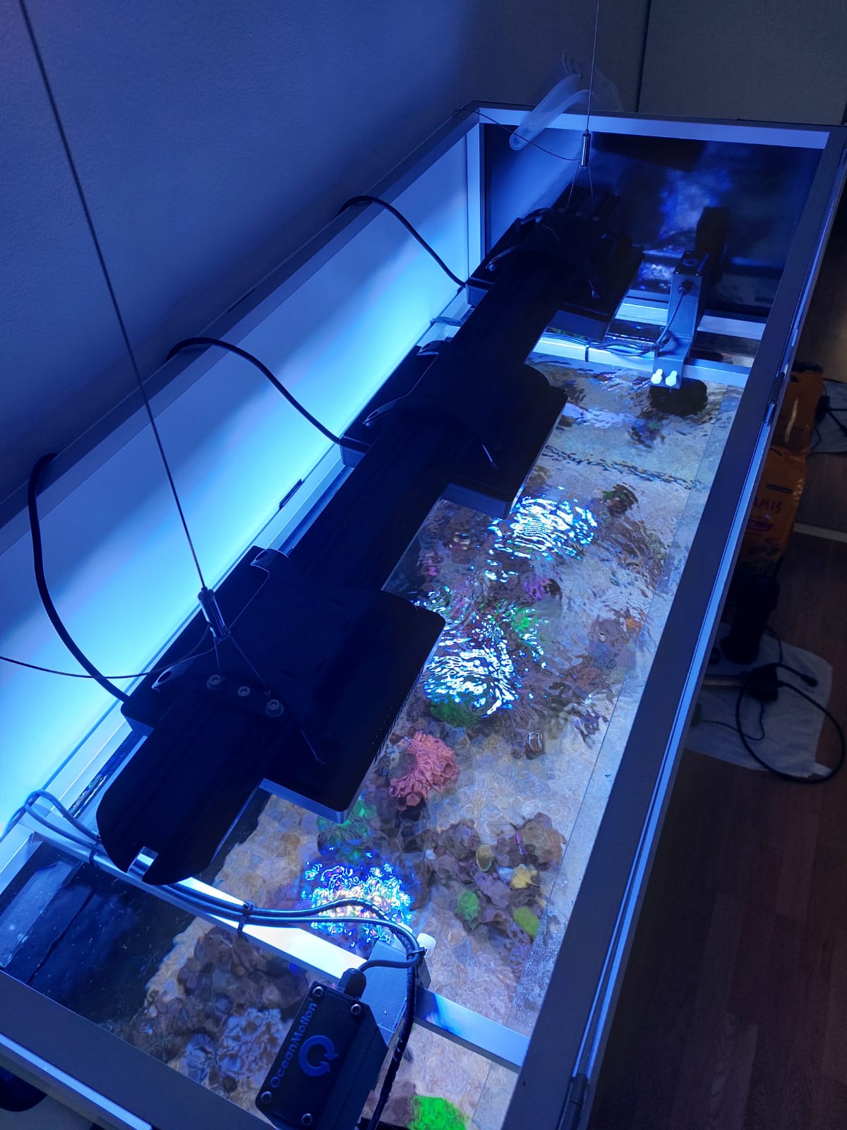Habe nun 3 Ecotech Marin Radion XR15 G6 über meinem 120cm Becken 20cm über dem Wasser bei einer Tiefe von 48cm hängen.